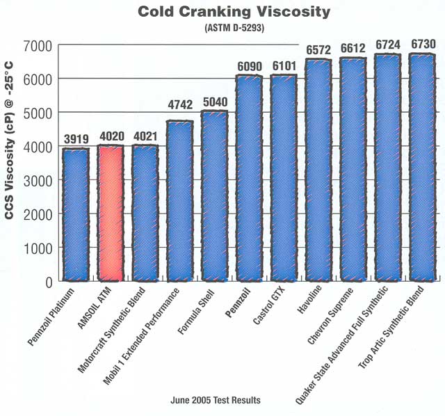 The Cold Crank Simulator Test determines the apparent viscosity of lubricants at low temperatures and high shear rates. Viscosity of lubricants under these conditions is directly related to engine cranking and startability. The lower a lubricant’s cold crank viscosity, the easier an engine will turn over in cold temperatures. The low cold crank viscosity of AMSOIL Synthetic 10W-30 Motor Oil reduces drag on moving engine parts and allows engines to achieve critical cranking speed in extremely frigid temperatures. Engines turn over quickly and dependably in the coldest winter temperatures.