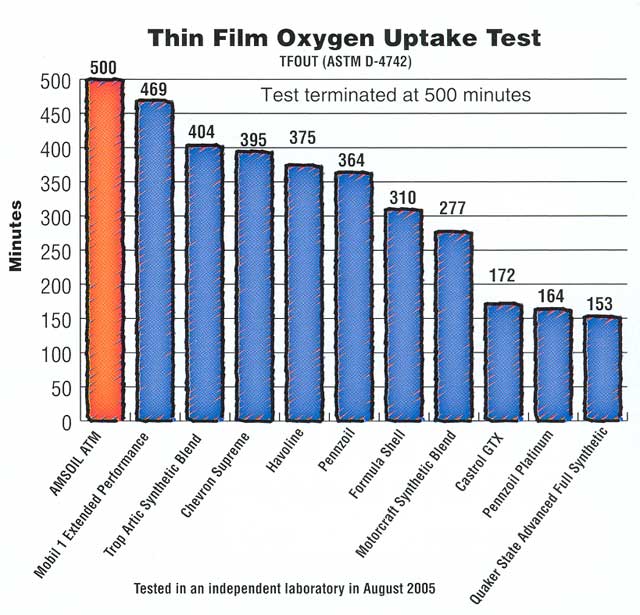 AMSOIL Synthetic 10W-30 Motor Oil (ATM) and 10 competing conventional, synthetic and synthetic blend 10W-30 motor oils were subjected to a series of motor oil tests. The competing oils included petroleum-based Castrol GTX, Chevron Supreme, Havoline, Formula Shell and Pennzoil, as well as synthetic-blends Trop Artic and Motorcraft, and full-synthetic Pennzoil Platinum, Quaker State Advanced Full Synthetic and Mobil 1 Extended Performance.